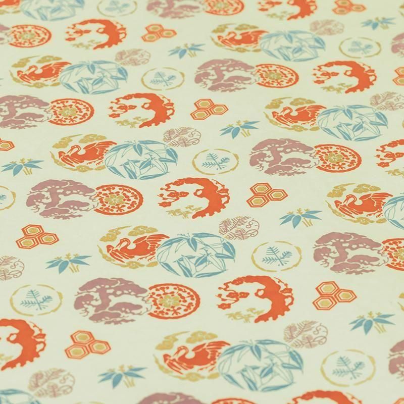 日本人が大切にしてきた吉祥文様を華やかに散りばめた縁起物づくしの図案です。松、竹、梅は寒さの中にも花や葉を咲かせる縁起物として尊ばれ、鶴と亀は千年万年生きる長寿の象徴とされています。