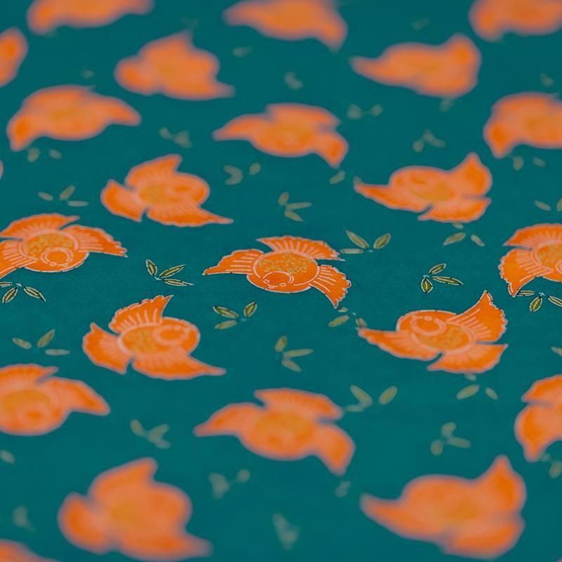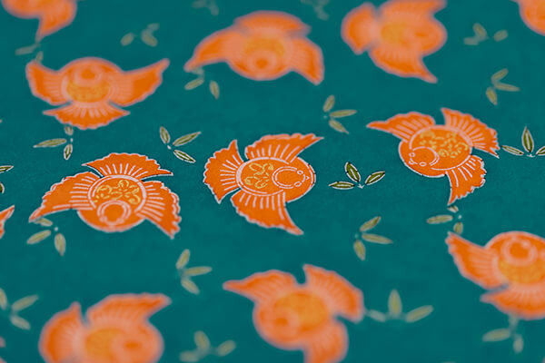 輪郭線には白の雲母摺を施し、すずめの背の描写には金を用いた千代紙です。光沢の対比が上品な華やかさを添えています。