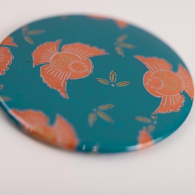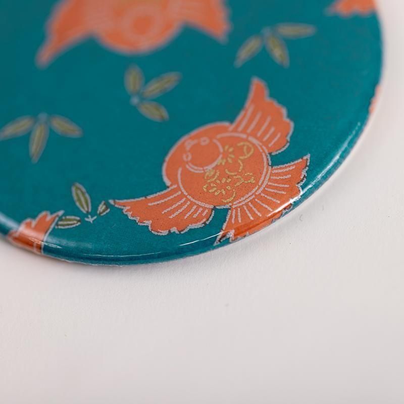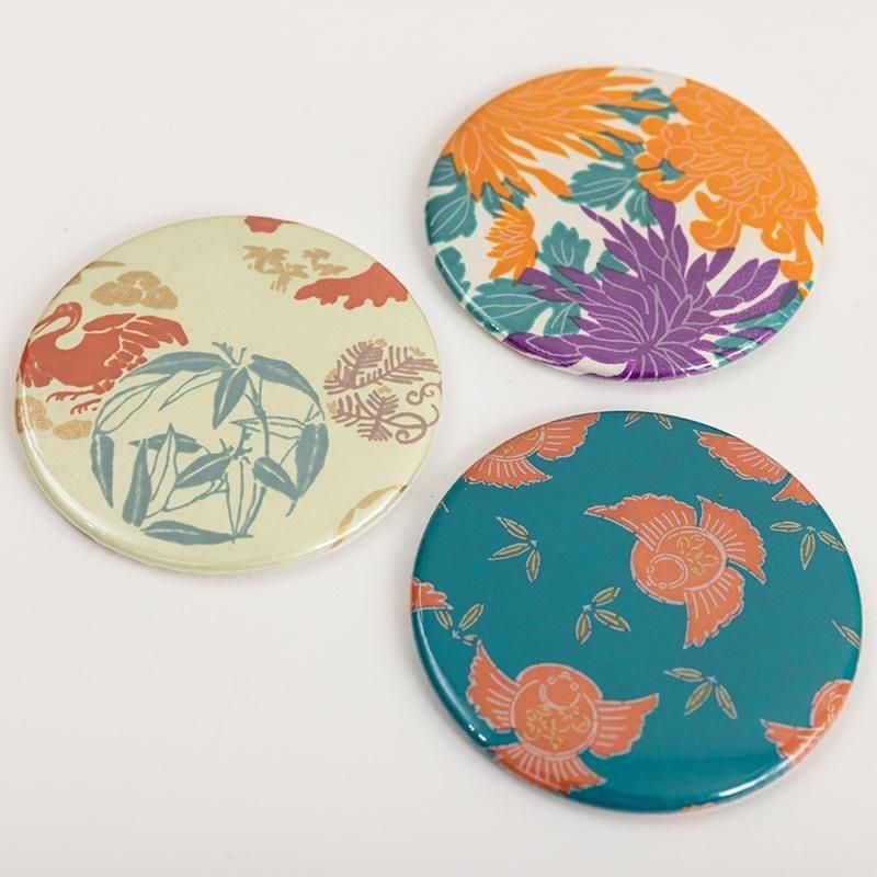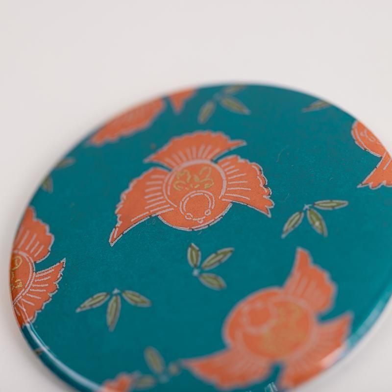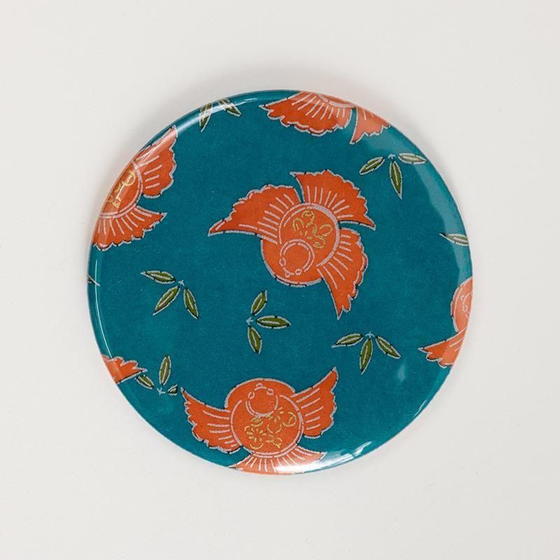 冬の寒さから身を守るため、羽の中に空気を含ませて膨らんでいるスズメの姿から「福良雀」と、めでたい文字を当てた文様。子孫繁栄や豊かさの象徴として、昔も今も愛されています。その千代紙を使った携帯用鏡です。