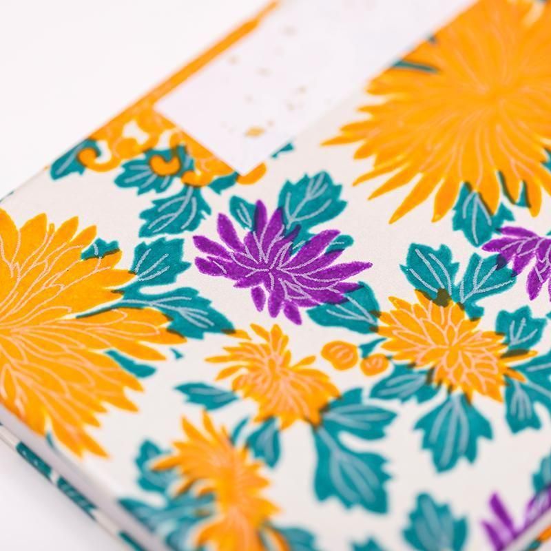 花びらを幾重にも重ねた大輪の菊が描かれた意匠です。花盛りを迎えた菊は、力強い生命力を感じさせるとともに、古来より菊が象徴してきた長寿や繁栄のイメージを鮮やかに映し出しています。その千代紙を用いて表紙を仕立てた、オリジナルの朱印帳です。