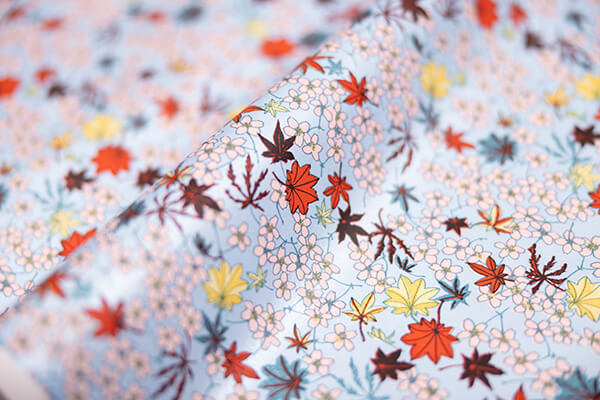 日本人の美意識を象徴する桜と楓を同じ図面に中に配し、一層の華やかさを際立たせた千代紙です。 真珠のような光沢のあるブルーを背景に、自然の織り成す色彩が鮮やかに描かれています。