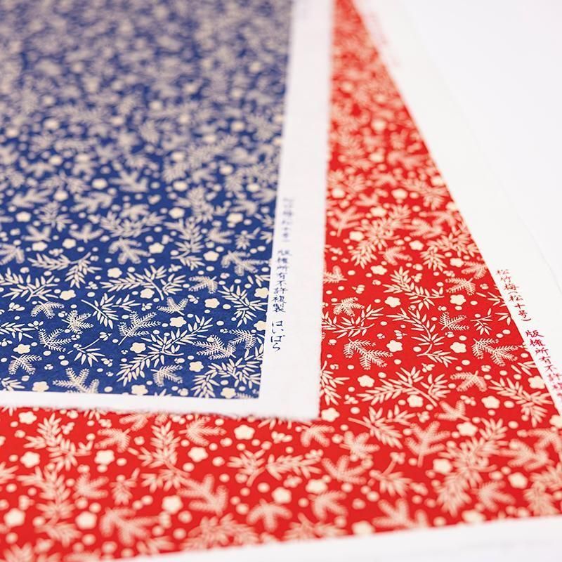 【松竹梅】は、古くから親しまれてきた吉祥紋様ですが、この千代紙では樹木の姿ではなく、花や、葉や実を全体に散らしたデザインとなっており「おめでたい事が皆様の間に広がりますように」という意味が込められています。